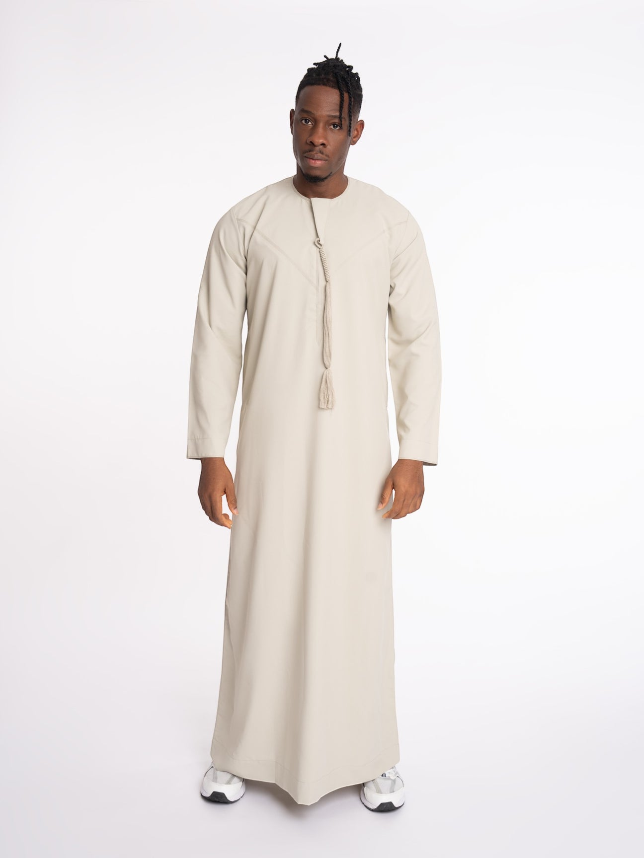 New basic emirati jubba collection for Ramadhan 2025. Remember our basics collection thobes are all limited in number. Matte finish fabric with our authentic emirati emboridery, a removable tassle for your conveniance.