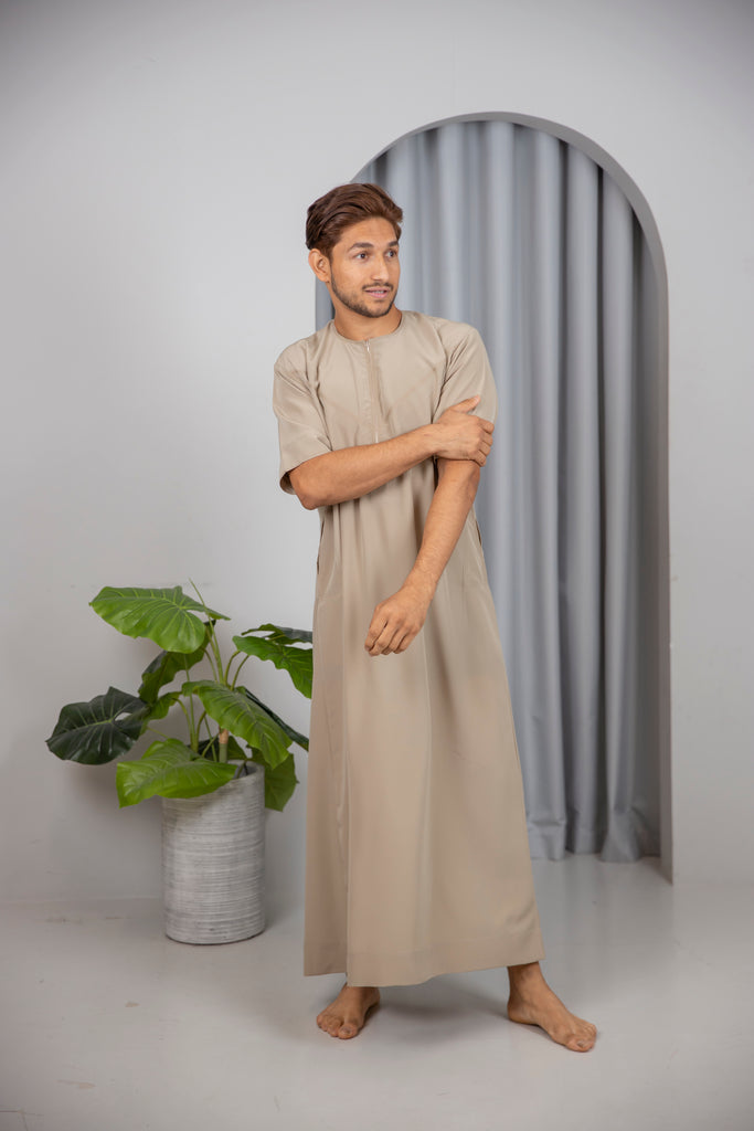 This premium dark beige half sleeve thobe offers premium luxury with an exclusive soft fabric. Made in-house in the UAE, it features a zip chest, half sleeve thobe, and a premium finishing for an elegant look.