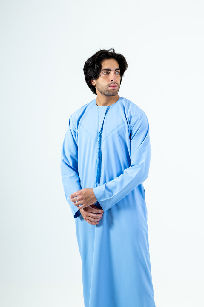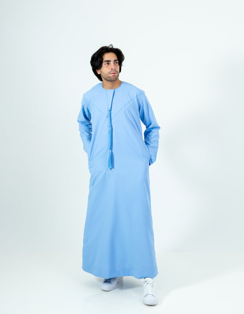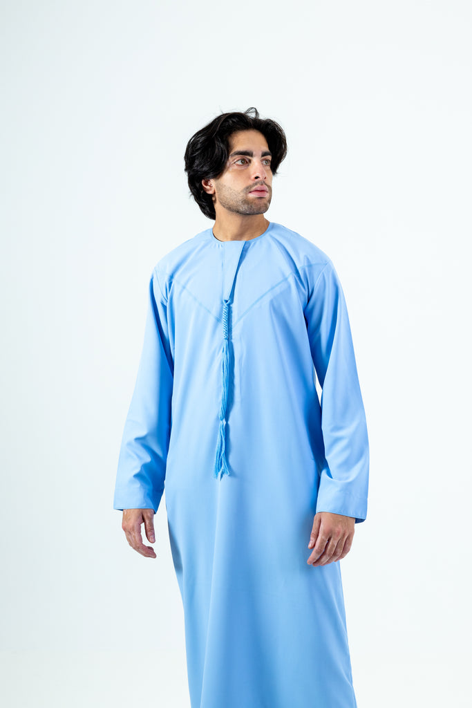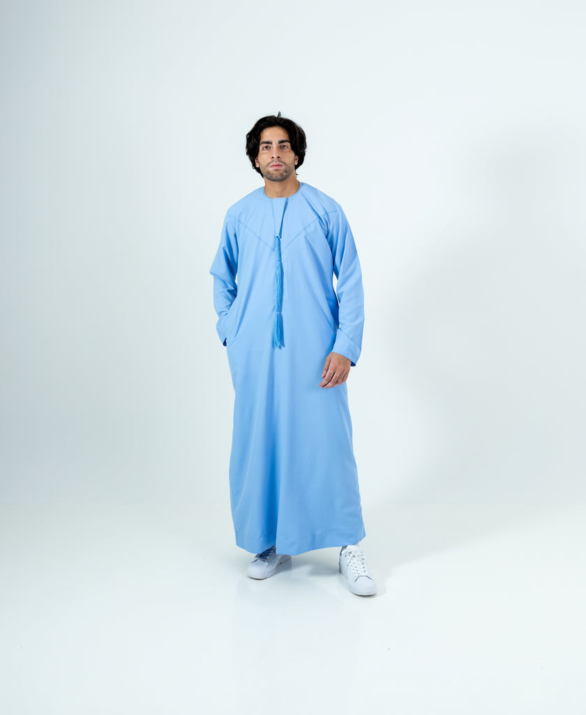 Introducing our Basic Sky Blue Emirati Jubba, the epitome of luxury and sophistication. Hand-crafted in the UAE as part of our new RM24 Hub Alhaya Basics collection, this authentic piece features a round collar, chest zip, and exquisite hand-stitched embroidery on the chest and wrist. Made from our exclusive soft polyester fabric, elevate your wardrobe with this standout piece.