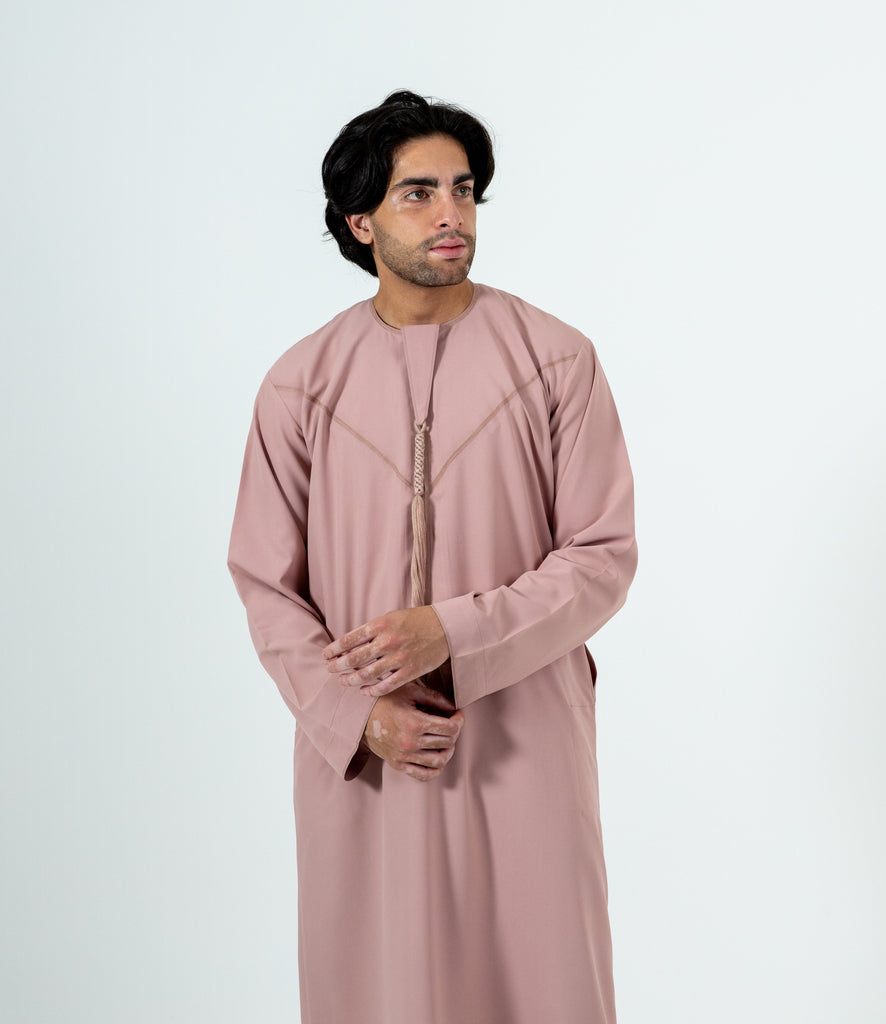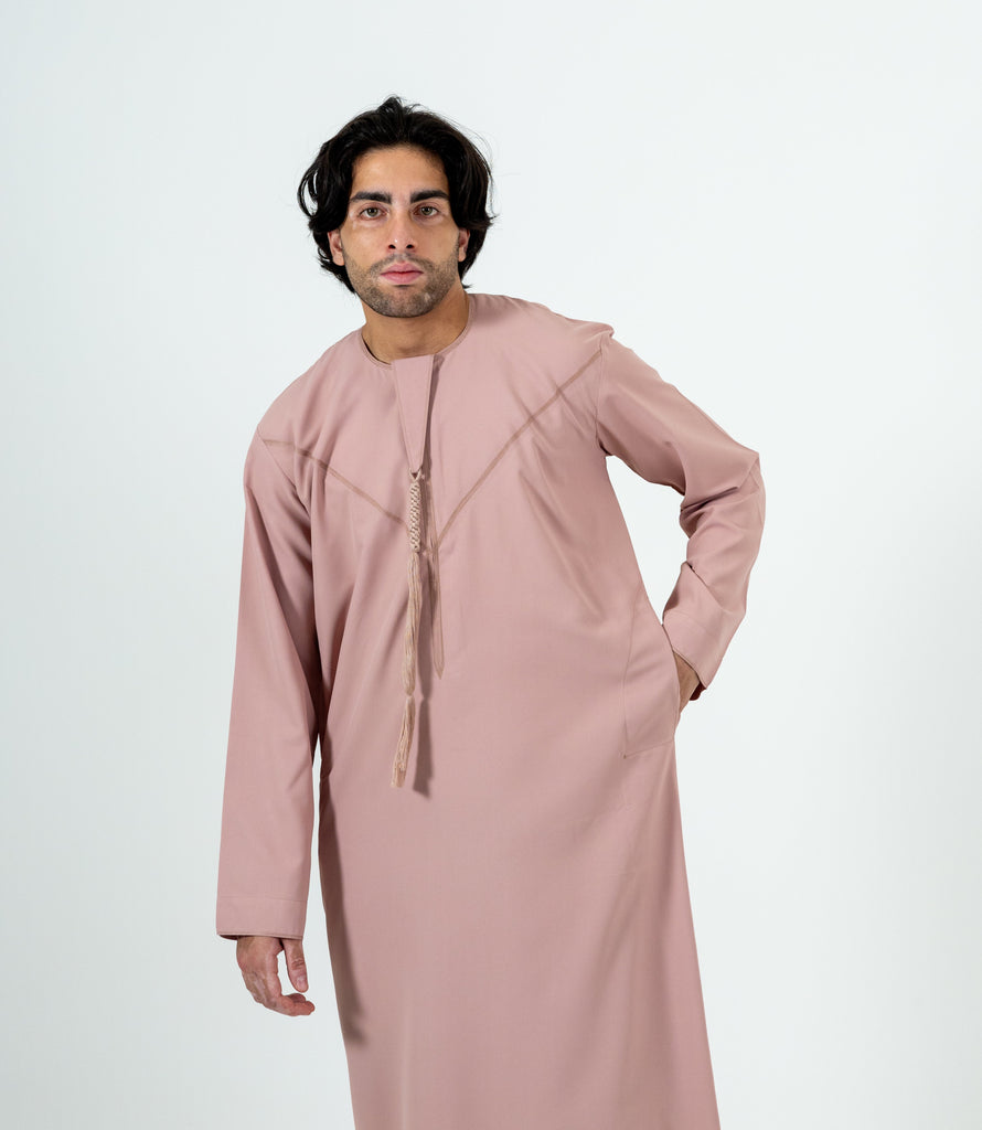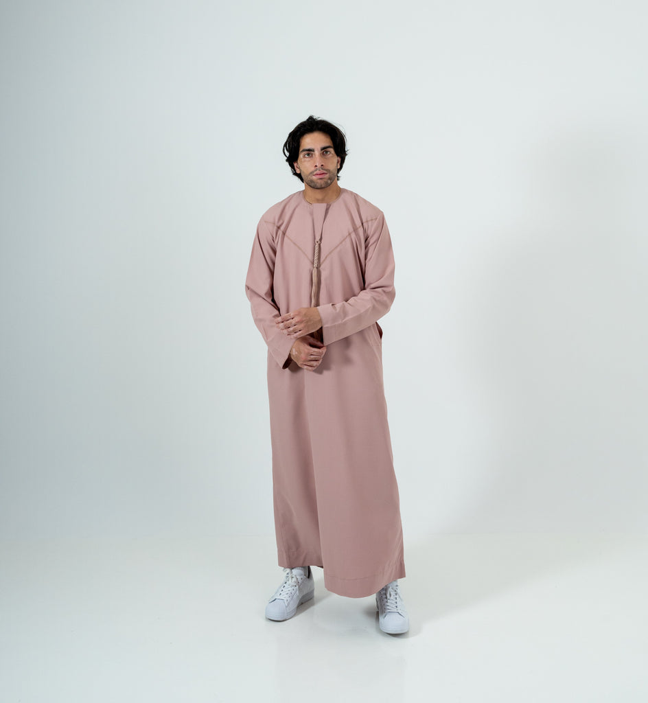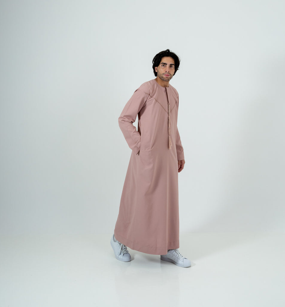 Introducing our Boys Basic Pink Emirati Jubba, the epitome of luxury and sophistication. Hand-crafted in the UAE as part of our new RM24 Hub Alhaya Basics collection, this authentic piece features a round collar, chest zip, and exquisite hand-stitched embroidery on the chest and wrist. Made from our exclusive soft polyester fabric, elevate your wardrobe with this standout piece. Match this with our adult basic pink thobe.