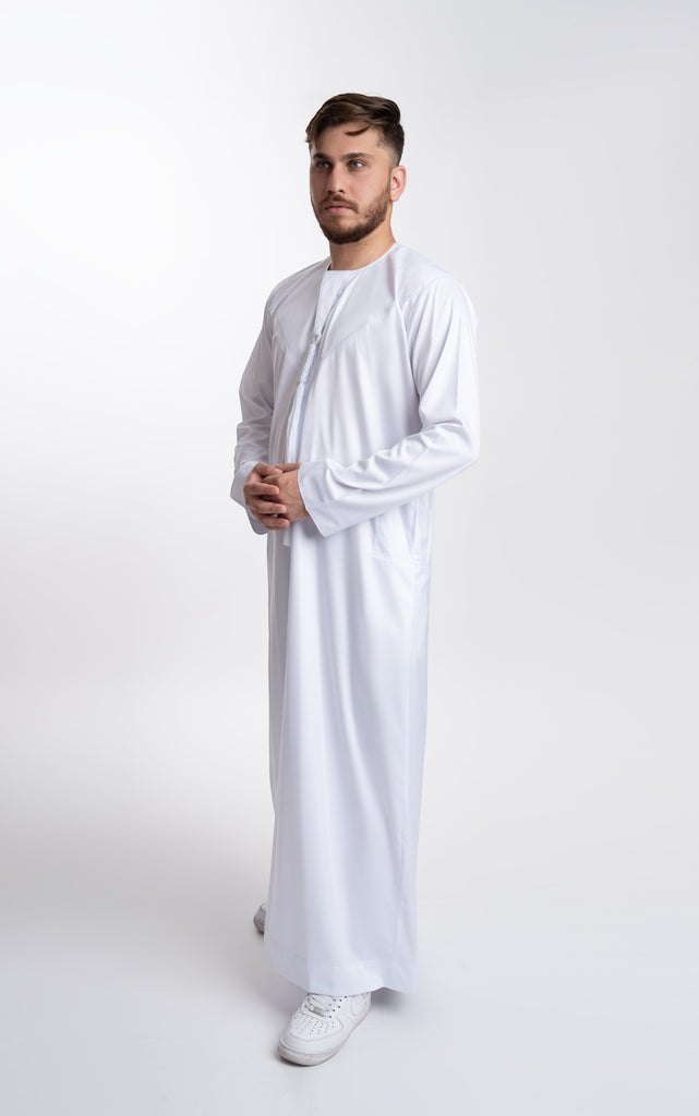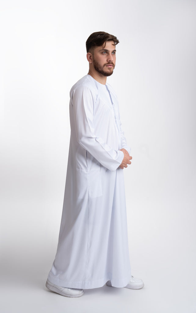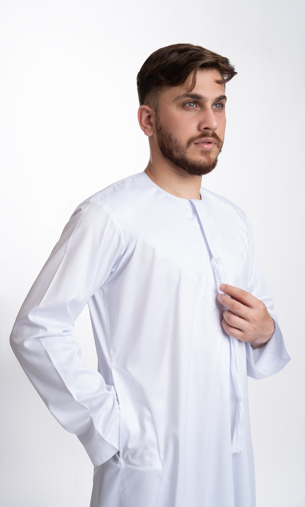 Experience the craftsmanship of the Middle East wearing our exclusive White Emirati Thobe. Hand made in the UAE with luxurious Vietnamese polyester, this traditional thobe offers a round collar, removable tassle, and a zip chest with a silk-like feel and pure white colour. Step out in style and opulence.
