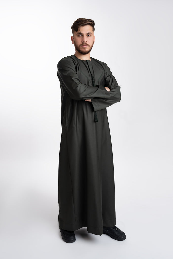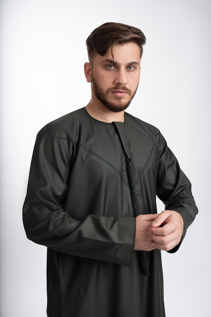 Discover the ultimate in comfort and style with our Royale Emirati Thobe. Handmade to perfection, this traditional garment is made from exclusive Hub Alhaya fabric and features a removable tassle. Elevate your wardrobe with our exquisite design. Upgrade to the new Emirati Collection now.