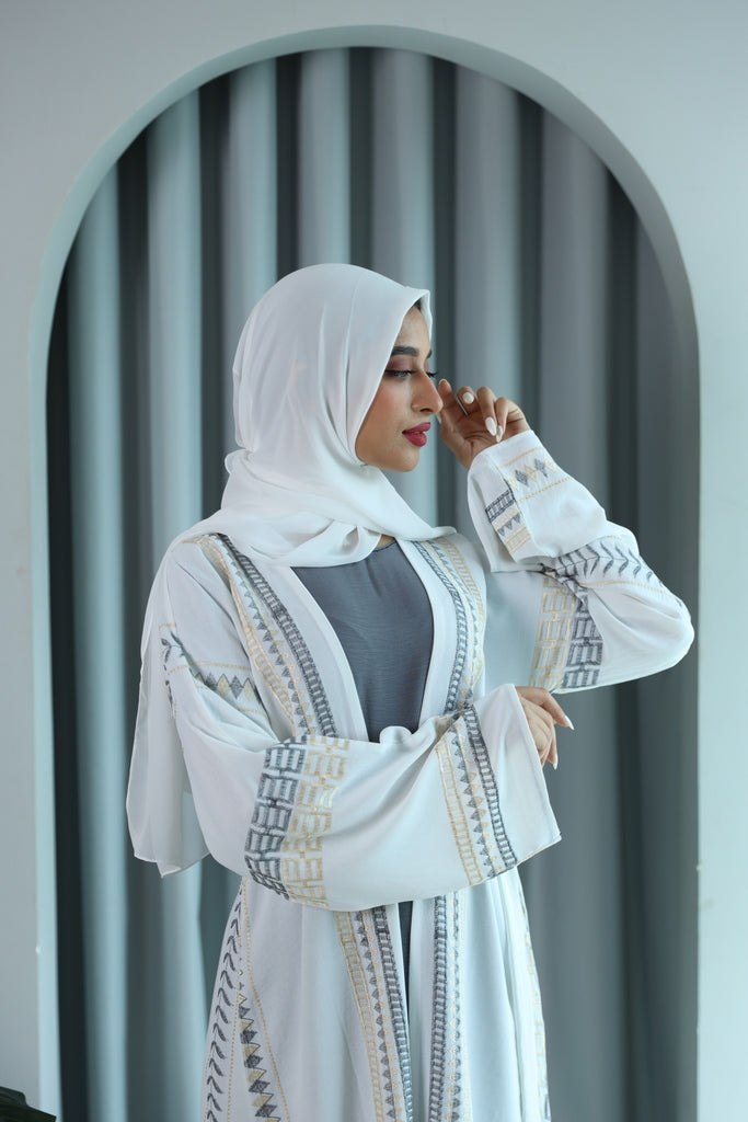 Four Piece Aztec Embroidered Open Abaya - White And Grey