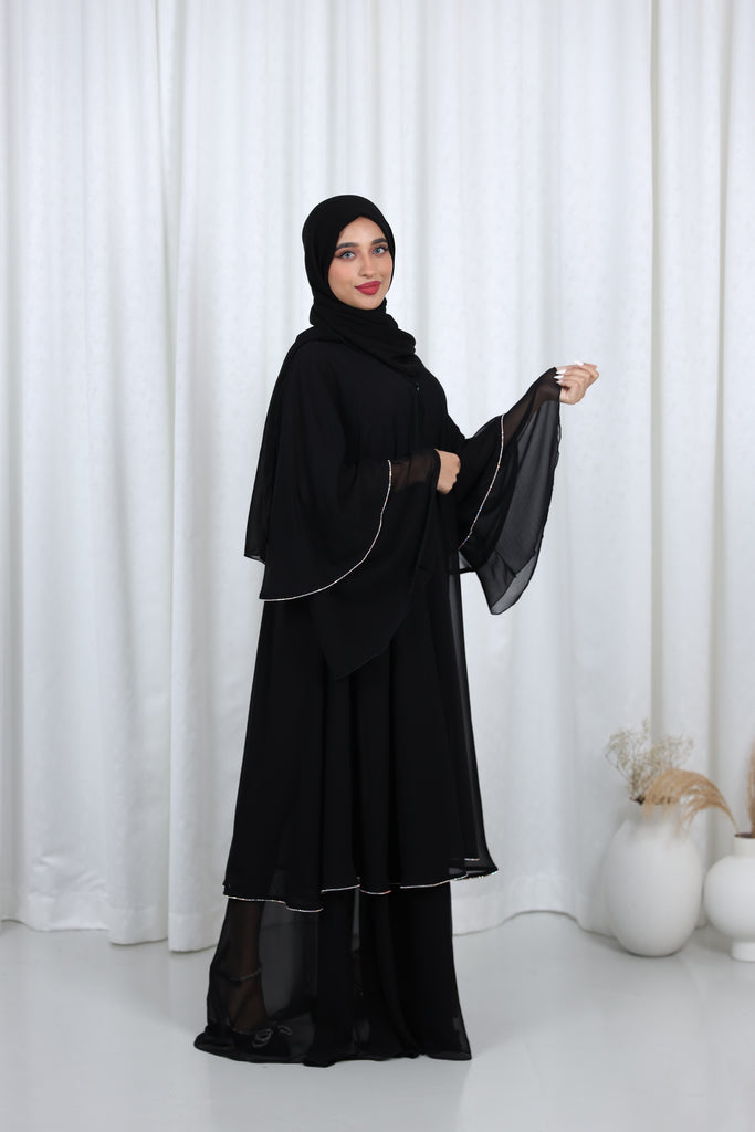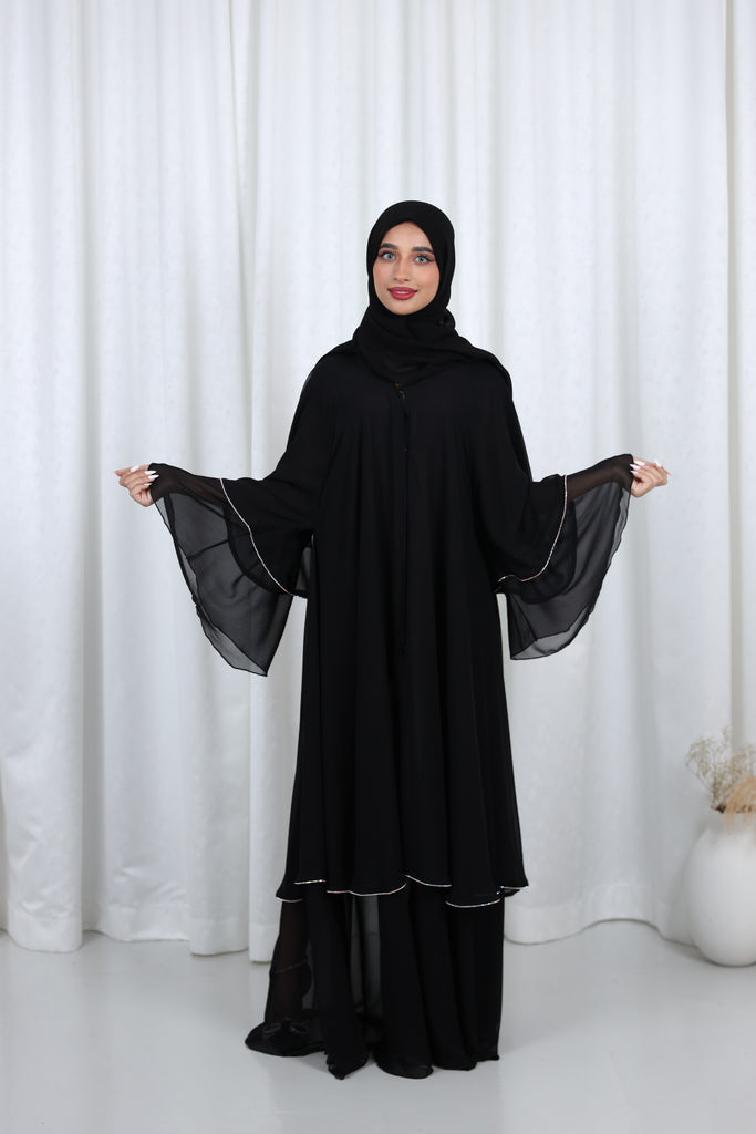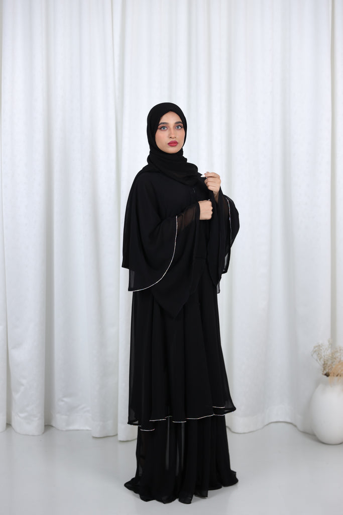 Be noticed in this luxurious black layered abaya with a magnificent diamante trim. Crafted from elegant fabric and a button close, it can be styled open or closed to suit any occasion. With a flowing design, you’ll easily stand out in this sophisticated piece.