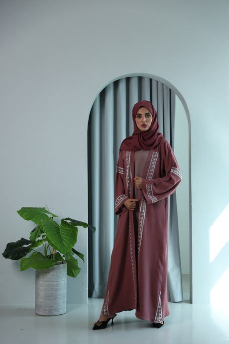 Four Piece Aztec Embroidered Open Abaya - Dusty Pink