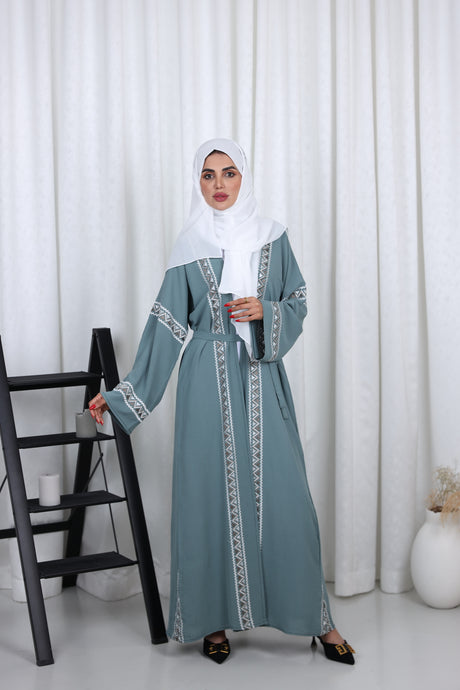 Four Piece Aztec Embroidered Open Abaya - Mint And White