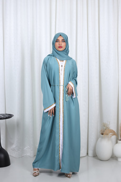 Look beautiful in this Open Glitter Abaya! Its gorgeous coral-hued Nidha fabric, gold lace accents will have you twinkling with every step. The open abaya & stitched slip dress are complemented by the waist tie, making it both stylish & comfortable. Shine on!