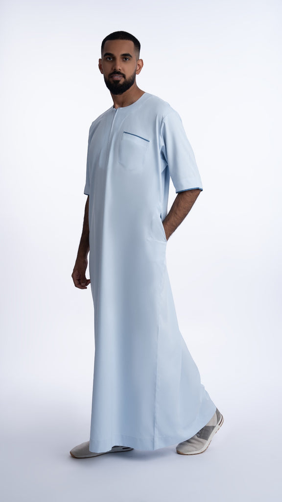 Introducing our Basic Sky Blue Half Sleeve Thobe, part of our Basics collection. Hand-finished in the UAE, this thobe features a convenient pocket and subtle blue piping for a touch of color. Perfect for everyday wear, whether you're running errands or attending a casual event.