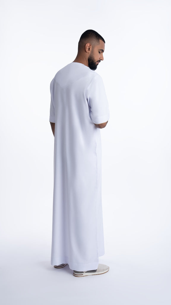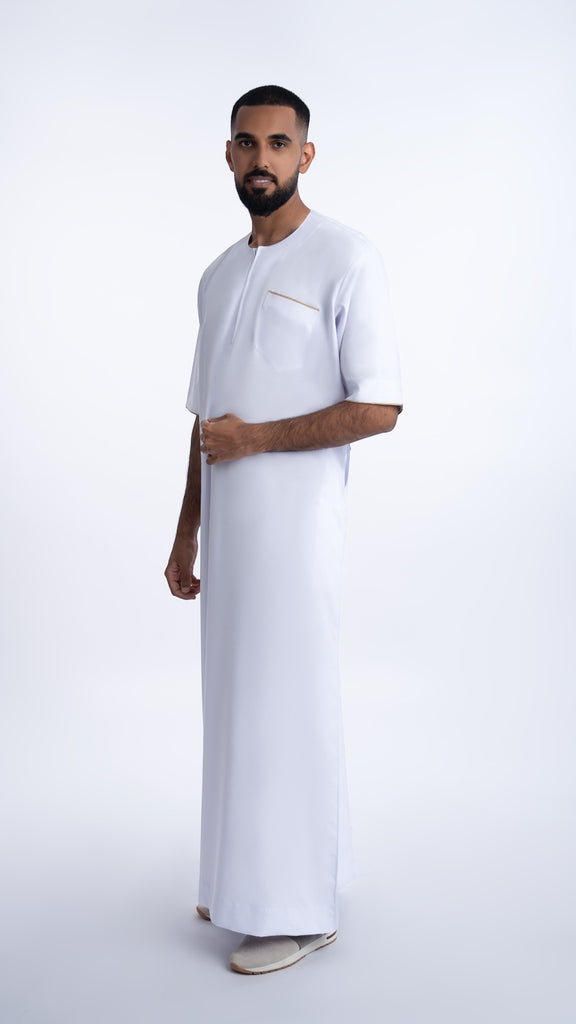 Introducing our Basic White Half Sleeve Thobe, part of our Basics collection. Hand-finished in the UAE, this thobe features a convenient pocket and subtle gold piping for a touch of color. Perfect for everyday wear, whether you're running errands or attending a casual event.