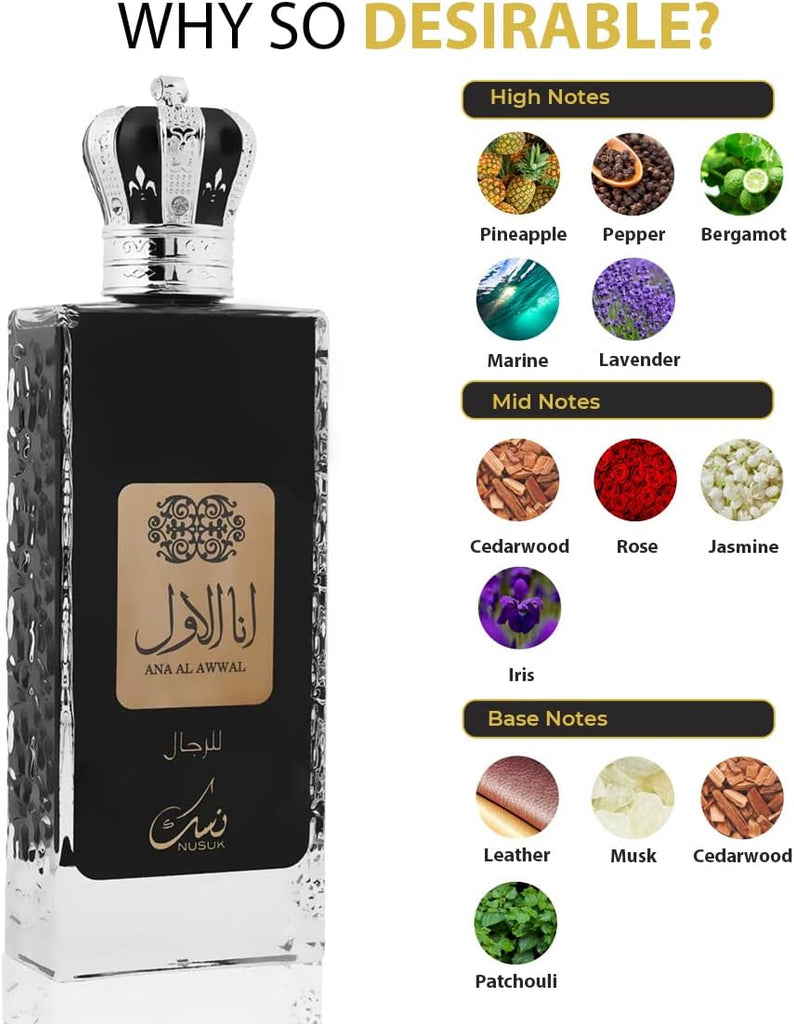Ana Al Awwal - Nusuk is a fragrance for the modern sophisticate. Blending oriental fresh notes with woody and airy elements, the light and alluring scent evokes a subtle yet unmistakable presence. Its 100ml bottle is the perfect accessory for everyday wear, offering a sweet, fruity and soft base for a laid-back, but elegant vibe.