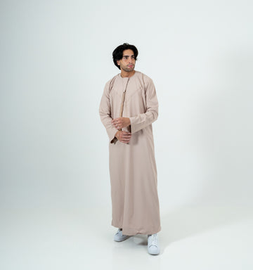 Introducing our Basic Apricot Emirati Jubba, the epitome of luxury and sophistication. Hand-crafted in the UAE as part of our new RM24 Hub Alhaya Basics collection, this authentic piece features a round collar, chest zip, and exquisite hand-stitched embroidery on the chest and wrist. Made from our exclusive soft polyester fabric, elevate your wardrobe with this standout piece.
