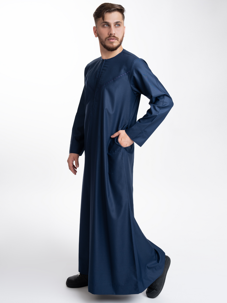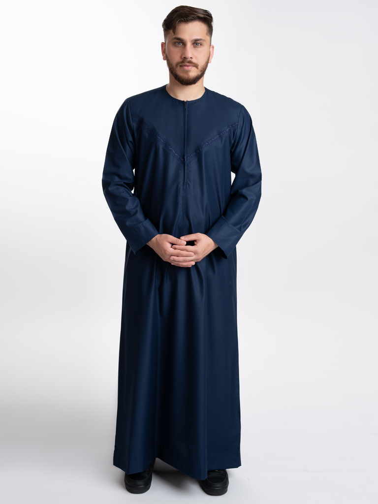 Experience luxury and elegance with our Dark Blue Emirati Style Jubba. This new addition for Ramadhan 2024 features intricate chest embroidery and is crafted from premium quality fabric. Elevate your style with this hand-crafted thobe, inspired by the rich culture of the Emirates.