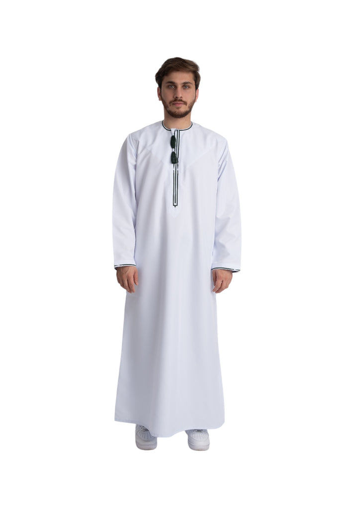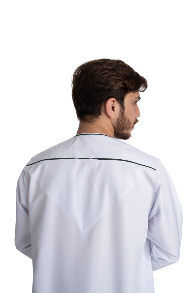 Introducing Haya White Omani #002 Forest, the authentic and luxurious thobe expertly handcrafted in Muscat, Oman. Adorned with intricate Buraimi embroidery on the cuff, neck, placket, and back of shoulders, this elegant and sophisticated piece from Hub Alhaya Exclusive Design is perfect for Eid and beyond. Elevate your wardrobe with this exclusive thobe now.
