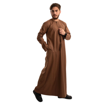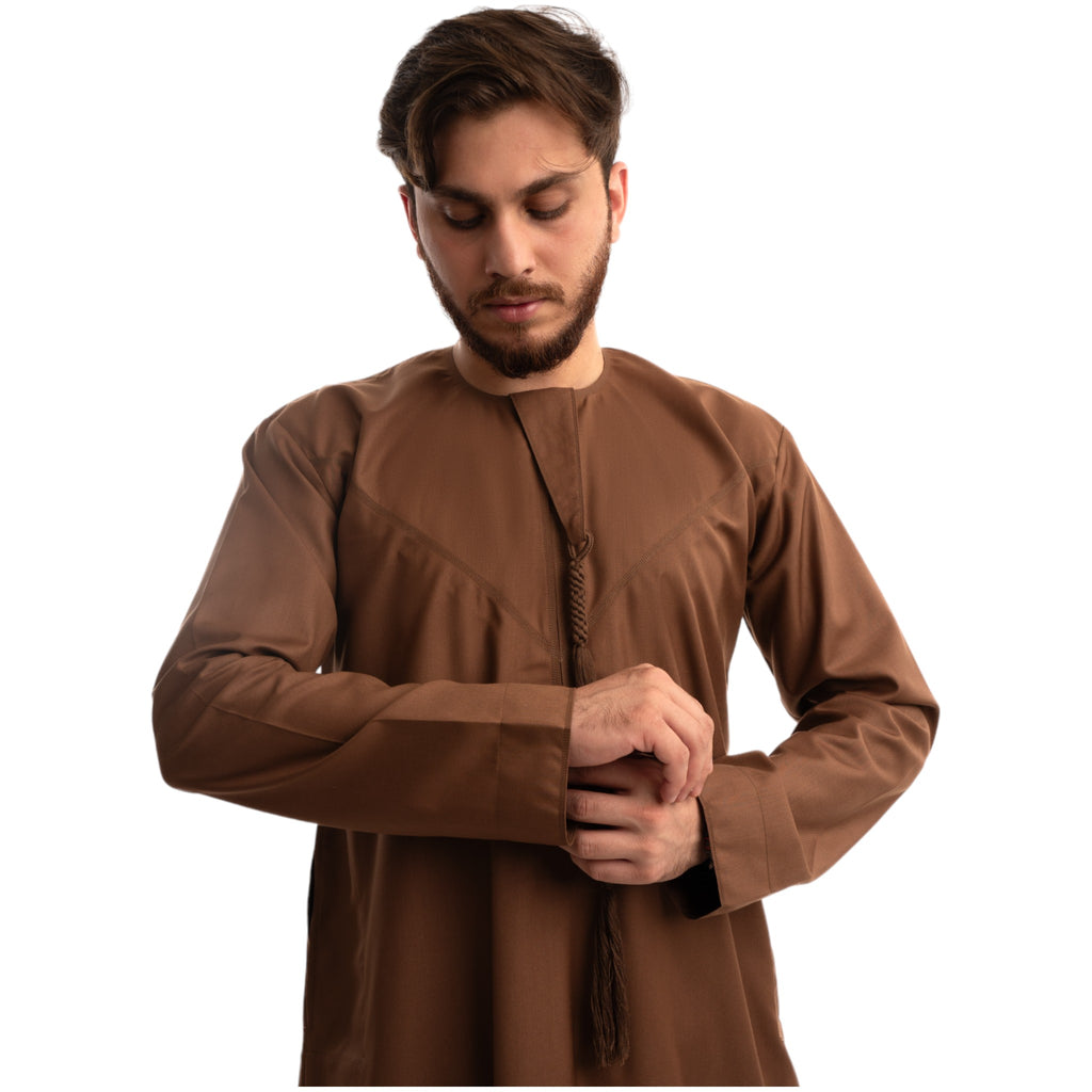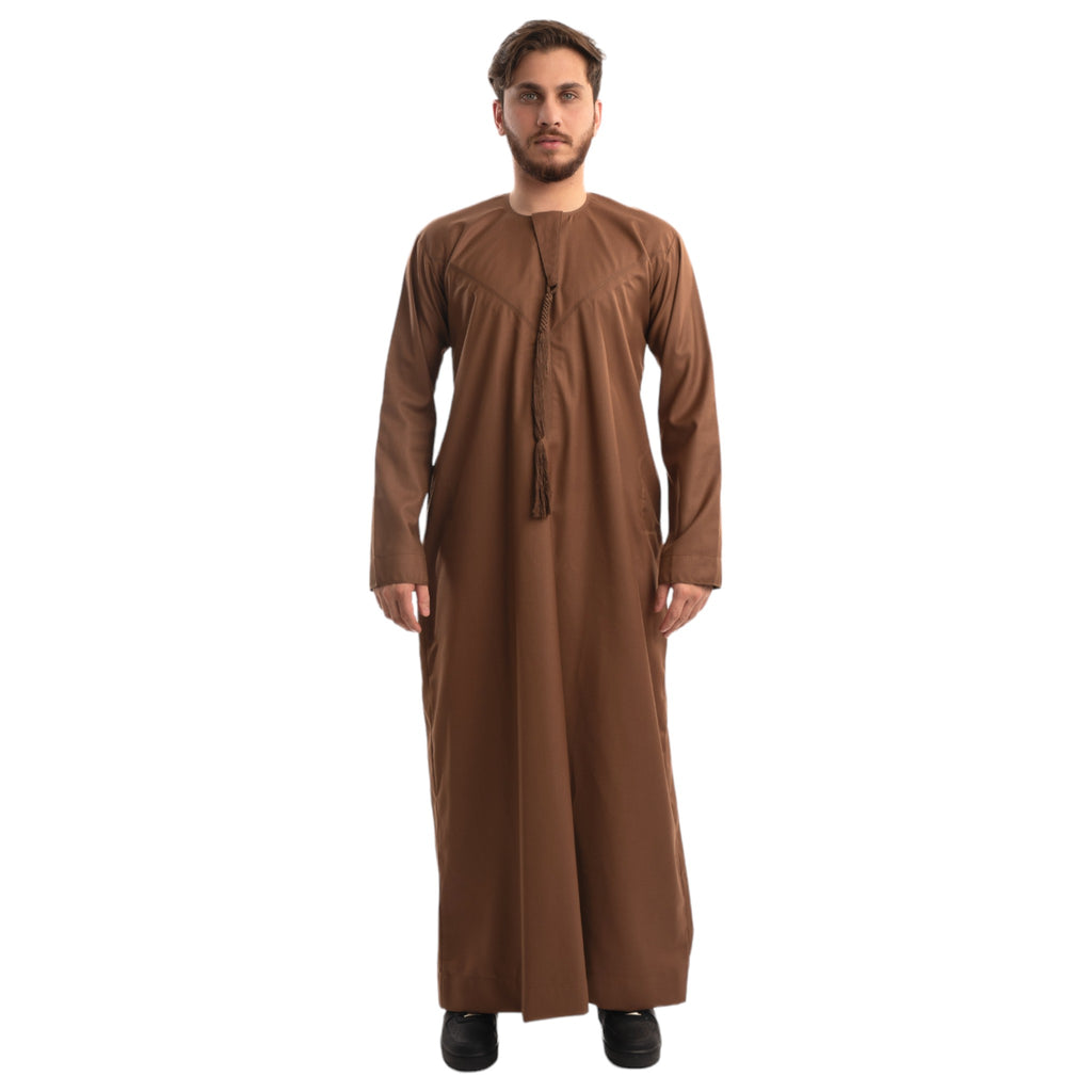 Discover the ultimate in comfort and style with our RM24 Royale Emirati Thobe. Handmade to perfection, this traditional garment is made from exclusive Hub Alhaya fabric and features a removable tassle. Elevate your wardrobe with our exquisite design. Upgrade to the new Royale Emirati Collection now.
